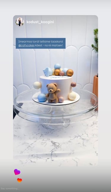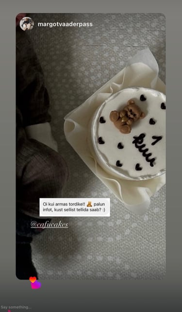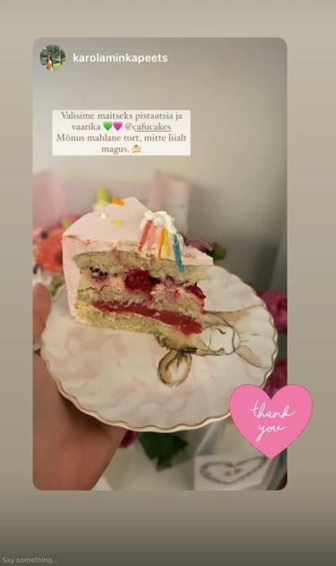 ”Täname teid väga teie töö eest. Koogid olid niiiiiii maitsvad, suvised, kerged, täis marju ja üliilusad!! Kõikidele väga, väga meeldisid. Saime palju positiivset tagasisidet 🩵
